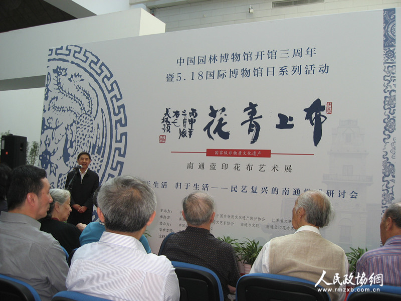 中国民间文艺家协会书记罗杨于会肯定了南通蓝印花布印染技艺代表性传承人、第五届中国工艺美术大师、南通蓝印花布博物馆馆长吴元新四十年来一直竭 尽全力?;ず痛忻窦浯忱队』ú家帐跛鞒龅墓毕?。梓涵摄影报道_副本