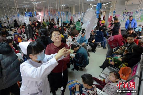 资料图:山西省太原市妇幼保健院,众多家长带着孩子前来挂号看病。中新社发 韦亮 摄