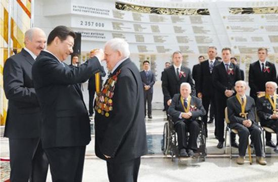 习总书记在博物馆会见了15名白俄罗斯二战老战士,并向他们颁发纪念奖章。他们中有11人曾在中国东北参加中国军民对日本作战,为中国人民抗日战争胜利作出了积极贡献。