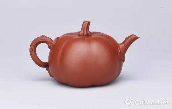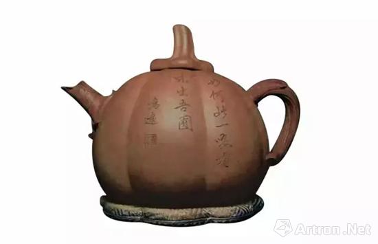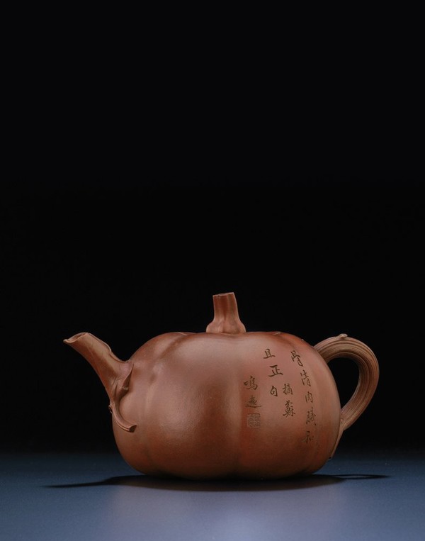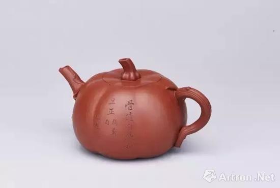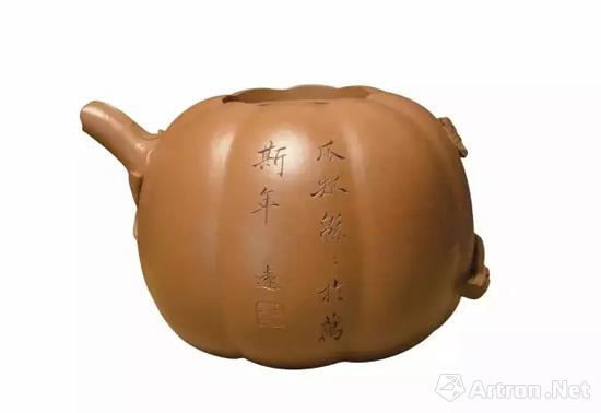 南瓜是一种外来的瓜果食材,传入中国甚早,常被中国人用来祝颂子孙生生不息,事业昌盛兴旺。宜兴地处江南鱼米之乡,物产丰富,因此紫砂常以此为题材。相较于其他清初紫砂器,陈鸣远的作品风格、特点及品类也有文字的记载,尤其是陈鸣远与曹廉让的合作,曹题铭文便是一条重要的线索。