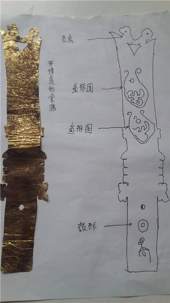 “牙璋虎形金箔”前期为帝王秘密兵符,后期人们用于最高等级的祭祀活动,见图,老虎撕裂刀尖站在中间做吼状代表不要战争,器物中间两条鱼形图案代表如鱼似水的和平幸福生活,两边齿状代表最高规格祭祀,图形下面有鼓形等乐器形代表人们欢天喜地在在鼓乐各种声乐中庆祝盛大祭祀祈求和平!此器物代表古人超凡智慧,禺意明确,已向联合国教科文组织申请为“世界和平”标志,更具象征意义!