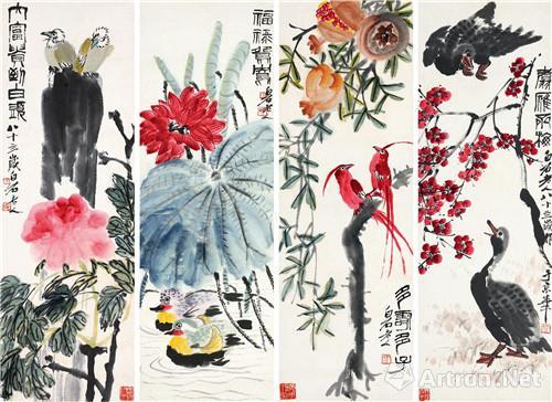 附图5、齐白石 1947年作 花鸟四屏(2014年保利5577.5万元成交,2010年嘉德9200万元成交)