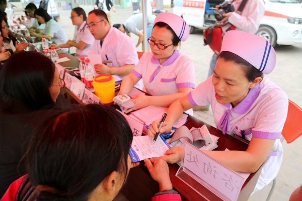 本次义诊活动,农工党江津区工委组织了内科、外科、妇科、儿科、眼科、护理等多名副高级职称以上专家,可谓阵容强大。上午9点,义诊在石蟆车站旁正式拉开序幕,预先得到消息的群众自觉排起长队等候。义诊现场医生们认真对群众进行心肺听诊、理学检查等,护理专家们热情地为群众测量血压、检测血糖和检查心电图,秩序井然。医疗护理专家针对群众不同的病症给他们提供合理的检查和治疗方案,开具处方,综合群众平时症状和既往疾病给予了合理的饮食、保养等建议。与此同时还对群众健康咨询进行了耐心解答,告诉他们疾病预防的重要性,宣讲了高血压、心脏病等常见病的预防知识以及健康保健知识,并发放了数百份健康宣传手册。