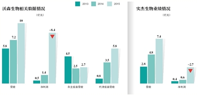 2015年,沃森生物实现营业收入10亿元,同比增长40%;净利润则亏损8.4亿元,同比下滑686%。