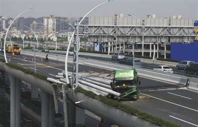 记者从现场路政人员处获悉,肇事车辆所载的30多根预制管桩重量共计100多吨,当时深夜闯行中环线高架的车辆有三四辆之多。目前,高架高速道路国家标准限制载重15吨以内,适合小型客车、客车快速通行,而两辆各载重上百吨的重载车显然是违禁上高架。