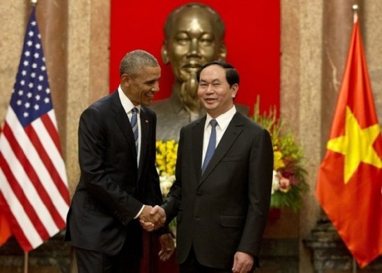 美国总统奥巴马 (左)与 越南国家主席陈大光(右)在会议