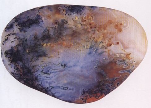 记得1989年前后是我收藏雨花石兴趣最高的时候。当时为了省几元钱路费,多买几块雨花石,我经常骑自行车到六合、仪征去觅石,每次基本上都是赶在满月前后。记得那年9月的一天,早上4点多就乘着月色骑车上路,直到傍晚6点才带着一小包雨花石往回赶。路上,我遇见一位石商收雨花石回家,说他最近收到一些好雨花石,邀我到他家去看看。我也顾不上饥肠辘辘与天色将晚,兴致勃勃地去了他家。石商端出一脸盆雨花石供我挑选。借着灯光,我仔细寻觅起来,选着选着,一枚《皓月当空》的美石(见图)跃入眼帘。该石长5.6厘米,宽3.6厘米,石中上方呈现出一轮皎洁如玉的朗月,又大又圆,周围与中下方的乳白色像月光映照似的,非常迷人。我爽快地付了钱,成交!