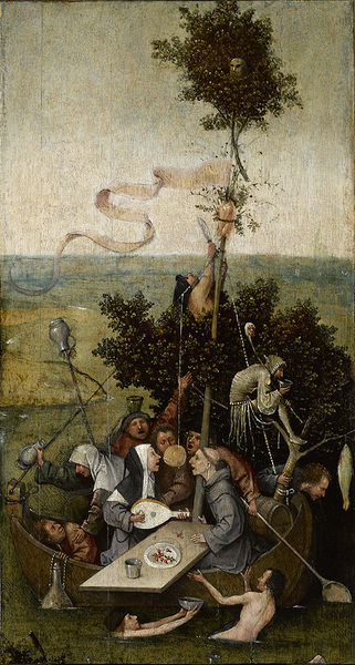 在画家的《愚人船》中,他将教士和修女安置在画面的核心位置,他们纵情欢歌,享用着水果美酒,丝毫不理会这艘孤舟将会何去何从。其余人物也都痴态尽显,各自肆意寻找快活。充当桅杆的,是一棵树,也许是神秘的树,知识的树,也是罪恶的树。一位愚人爬上树干,试图用刀把挂着的烧鸡拨下来。在树的顶端,有一只冷眼旁观的猫头鹰?;嫔铣涑庾拧熬乒砗枉吟阎健?,博斯的图像几乎是对勃兰特长诗的图解。