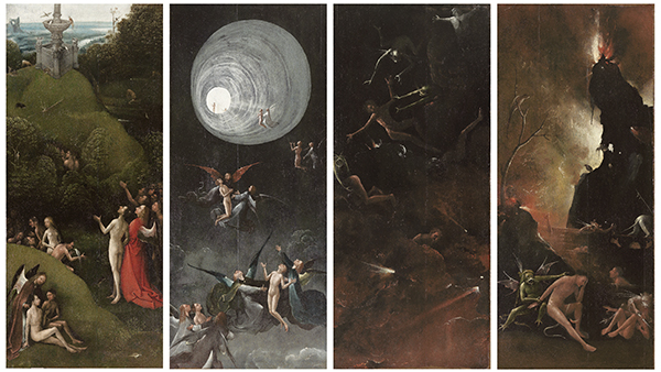 博斯作品《来世》,自左至右分别名为《天堂路——尘世乐园》、《天堂路——升天》、《地狱路——堕落》、《地狱路——地狱》,收藏于意大利威尼斯格里马尼宫博物馆。