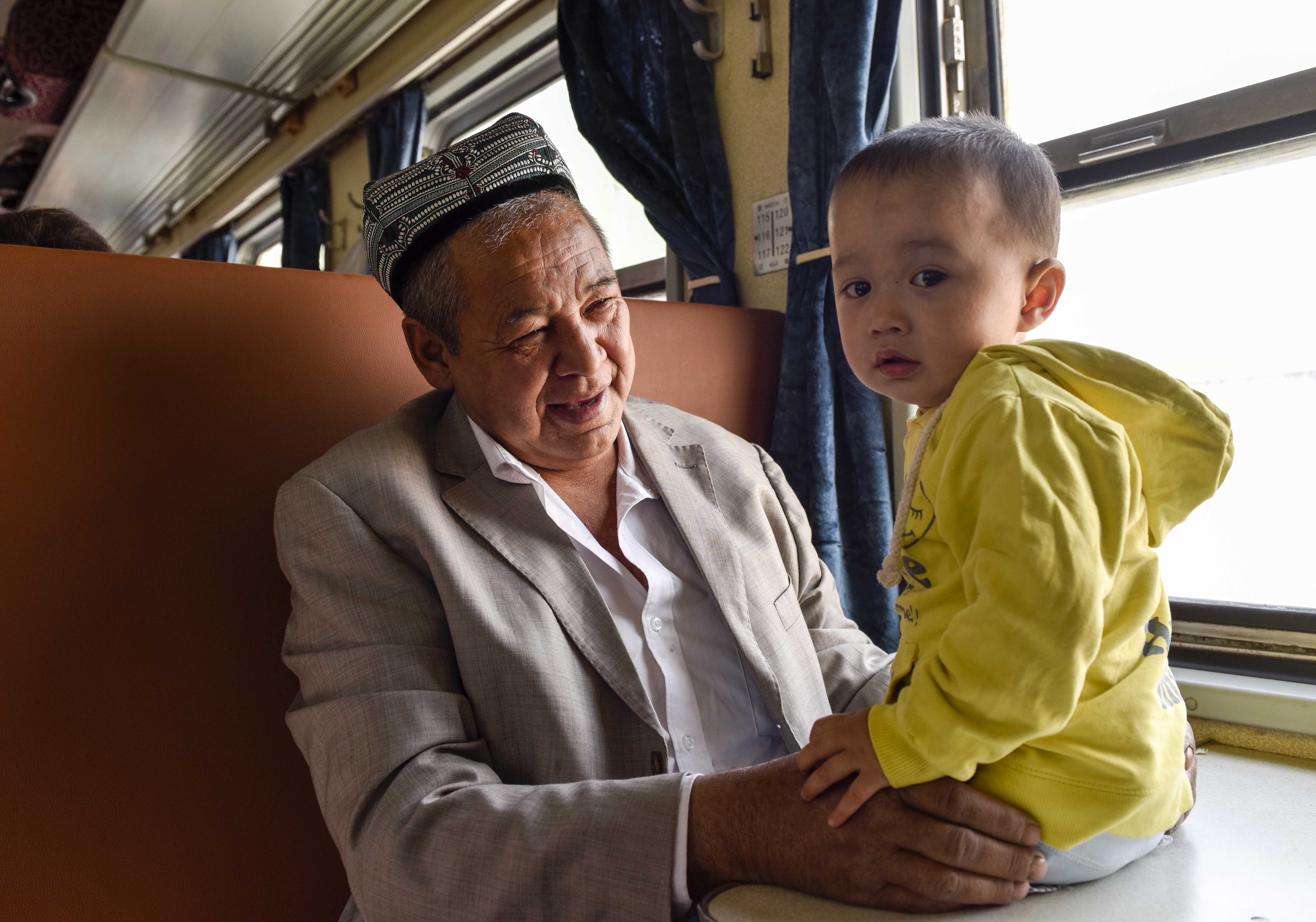 自5月15日喀什—和田的7559/60次普客列车开行以来,吸引了南疆广大地区的乘客。截至5月25日,已有8000余人次选择这趟列车出行。列车硬座全程票价仅需28元,让沿线群众享受到真正实惠,被称为“民族团结大篷车”。图为来自喀什的阿不力克木带着孙子乘坐列车,准备去和田的医院看病。新华社发