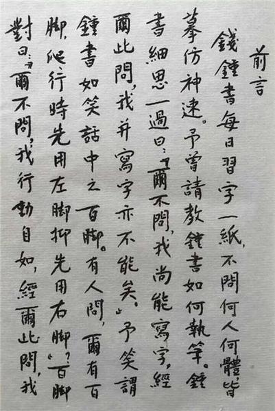 钱钟书的夫人杨绛说,钱钟书很勤奋,除了写文章,每天都要拿出一段时间来练字。古人碑帖见到哪个就写哪个,写哪个就像哪个。