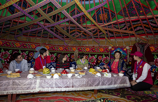 近日,记者跟随新疆大型网络文化活动“塔城的山花开了”采访团来到托里县的民宿家庭。女主人玛海﹒阿不扎尔的毡房精致温馨,衣柜、床和卧榻等家居物品俱全,哈萨克民族特色的手工刺绣品花毡色彩靓丽,墙上的挂着由芨芨草编织的装饰品图案精美。