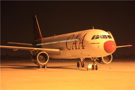 5月14日晚8点45分,由江苏工程职业技术学院购买的空客320飞机从法国途经哈萨克斯坦飞抵南通,在夜幕中降落兴东机场。学校供图