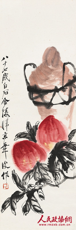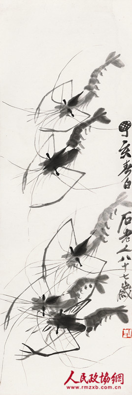 两件齐白石作品《大寿图》《群虾图》是作者87岁(1947年)的精彩之作,可视为白石老人此类作品的标准器。据桴浮堂主人回忆并纪念其父母的文章中所载,这两件齐白石作品与另两件本场展览的作品均是其父亲曾于二十世纪五十年代在北京荣宝斋购置,传承有序。《大寿图》寓意美好,绘两只硕大无比的寿桃置于一坛陈酒前,酒坛以赭石色绘制,边有一圈浓墨“编制”的提手,显得酒坛沉沉,酒香袅袅;《群虾图》绘五只大虾在水中游动,虽不著一水,却尽得水中灵动之美,五只虾三、两成行,似乎被左下前方的食物吸引,正在比着谁的体力更佳呢。