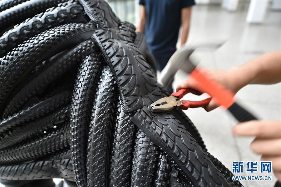 5月28日,河南洛阳师范学院大学生在对“轮胎恐龙”进行修整。河南洛阳师范学院5名大学生利用回收的约600个废弃自行车轮胎,耗时一个半月制作完成了一只高2.3米、长4米的恐龙模型。据团队成员刘子禅介绍,这只“轮胎恐龙”先用螺纹钢焊接出骨架,之后根据恐龙关节及肌肉的实际需要,将自行车车胎裁剪、扯平,包裹整个骨架。新华社发 黄政伟 摄 图片来源:新华网