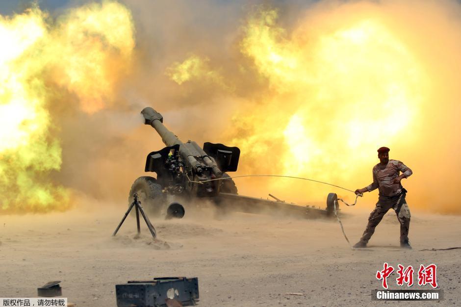 当地时间5月30日,伊拉克军队开始进入被“伊斯兰国”控制的重镇费卢杰。据伊拉克反恐部队的发言人萨巴赫·诺曼表示,当日凌晨,伊军展开了攻入费卢杰的行动,军队分三个方向,进入这座城市。图为伊拉克军队进行猛烈炮击。