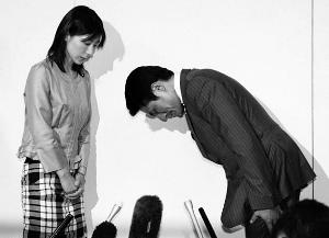 男议员铃木章浩向女议员盐村文夏道歉。