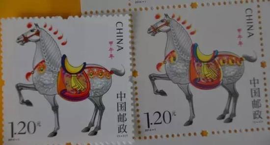 记者看到,2014年马年邮票,以一匹立马不卑不亢、悠然自得的优雅造型让人眼前一亮。在小陈的指点下,记者看到:正常票的马嘴部位是一根鲜红色的缰绳,而错版的则是一红一黄两根缰绳;装饰在马身上的牡丹、蝙蝠,正常票的颜色是红黄两色界限分明,错版的则出现两色交错、晕染;此外马的洛头缰绳,马鬃、马脖子上的攀胸及杏叶形饰物、铃铛等,只要涉及彩色的地方都存在错误。用放大镜查看对比,就会发现这些差异十分明显。