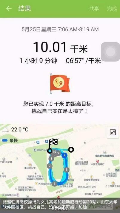 “我为女儿高考跑步助威的第一站是山大中心校区,仅仅3公里,我跑了一个小时,非常吃力?!辈苁髅ψ潘?,他之前从来不跑步,上学时经常逃操。如今,凭着毅力他坚持了下来,虽然工作很忙,但他五点半起床,平均每次跑8到10公里。终点站跑了16.66公里,朋友圈获得了80多个赞,都可以当长跑运动员了。