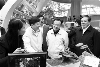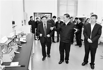 广西壮族自治区党委书记彭清华(右一)到广西大学可再生能源材料协同创新中心调研。