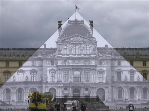法国艺术家让·勒内近日在巴黎卢浮宫博物馆前的玻璃金字塔入口处一面墙体上贴满卢浮宫的黑白照片,使其看上去与背后的建筑物融为一体,从而造成玻璃金字塔“消失”的视觉错觉。