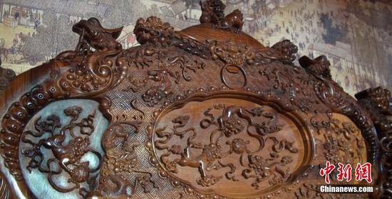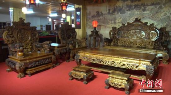 5月29日,“中国红木第一城”广西凭祥市红木文博城内,标价1.98亿元人民币的黄花梨十七件套宝鼎沙发——“盛世宝鼎”吸引民众驻足观看。