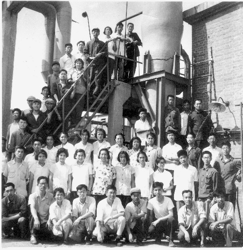 参加会战的科研人员在顺丁橡胶小聚合装置前合影