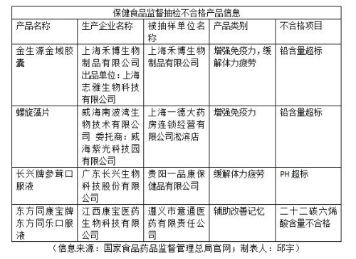 记者注意到,今年以来,辽宁、天津、上海、贵州等多地发布了保健食品监督抽检情况通告,在“抽检不合格产品”中就包括一些自称能增强免疫力、缓解体力疲劳的保健品,例如部分金生源金域胶囊、螺旋藻片等被检测为铅含量超标。