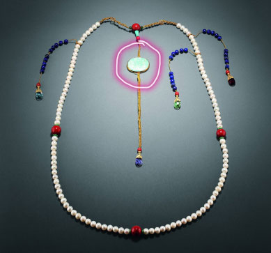 背云的搭配清代朝珠是由108粒珠贯穿而成,每隔27粒穿入1粒材质不同的大珠,称为“佛头”,与垂于胸前正中的1粒佛头相对的1粒大珠为“佛头塔”,由佛头塔缀黄绦,中穿背云,末端坠一水滴形佛嘴(坠角)。背云和佛嘴垂于背后。