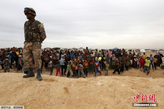 资料图:当地时间2016年5月4日,约旦首都安曼东部 Hadalat区,大批叙利亚难民在约旦叙利亚边境等待进入约旦。图为约旦叙利亚边境一名约旦士兵在放哨。