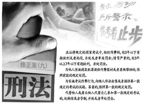 中国政法大学教授阮齐林说,刑九规范的是“法律规定的国家考试”,因此,除高考外,自学考试、教育考试、公务员考试、司法考试等也在规定范围当中。