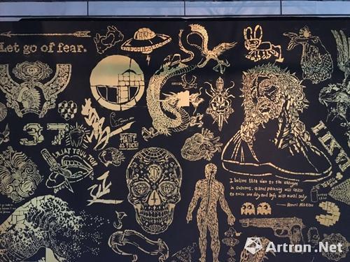 壁画专业的叶凌瀚称自己“很久没做壁画了”。他的作品《蔓延》高达两层,是“奇想阁”中最大的一件作品。古老的部落纹身、水手纹身和日本黑帮纹身等一系列的图示统一喷绘在黑色平面中,纹身的亚文化和流行文化在此“蔓延”。