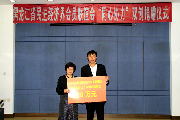仪式上,执行会长仲继冬代表黑龙江民进经济界会员联谊会向哈尔滨理工大学教育发展基金会捐赠创新、创业基金20万元人民币。