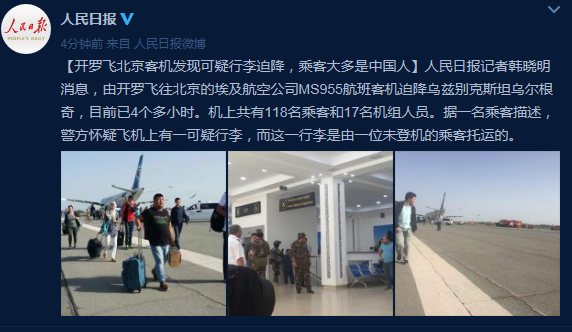 人民日报记者韩晓明消息,由开罗飞往北京的埃及航空公司MS955航班客机迫降乌兹别克斯坦乌尔根奇,目前已4个多小时。机上共有118名乘客和17名机组人员。据一名乘客描述,警方怀疑飞机上有一可疑行李,而这一行李是由一位未登机的乘客托运的。