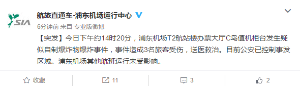 据@航旅直通车-浦东机场运行中心微博消息,今日下午约14时20分,浦东机场T2航站楼办票大厅C岛值机柜台发生疑似自制爆炸物爆炸事件,事件造成3名旅客受伤,送医救治。目前公安已控制事发区域。浦东机场其他航班运行未受影响。