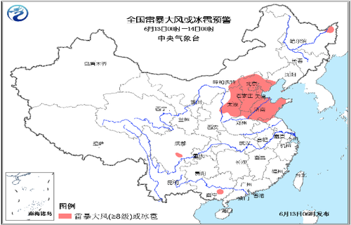 6月13日08时-14日08时,全国雷暴大风或冰雹预警。 中央气象台供图