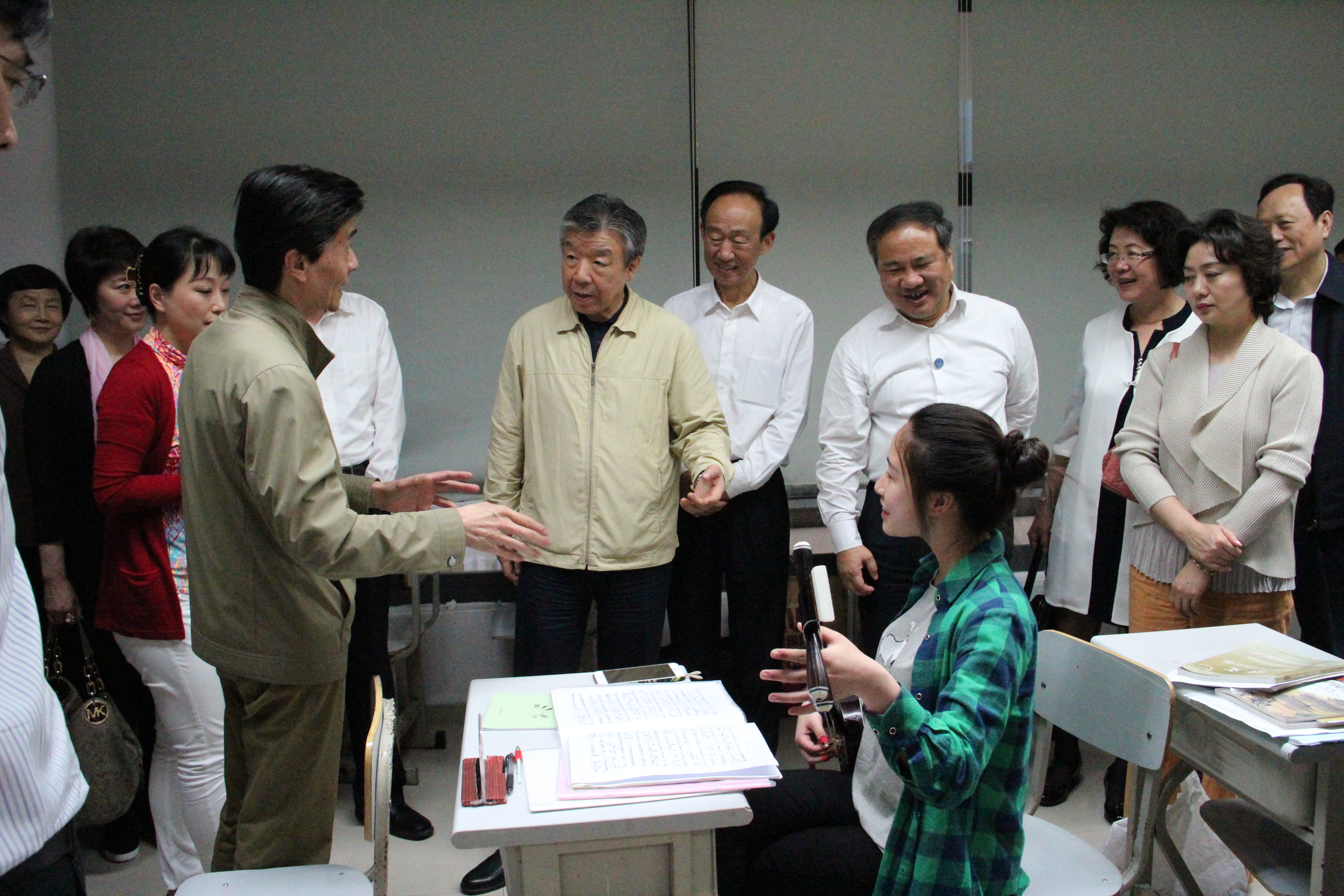 苏州昆剧院是古色古香的园林式建筑,古朴雅致、步移景异。亭台楼阁之中,调研组看到琴师在陪着演员吊嗓子、老师口传身授地给徒弟说戏,学生们毫不惜力地在练功……在一间垂挂着丝帘,充满诗情画意的房间里,几个学生们正在学习工尺谱。委员们不禁驻足一起研究,并鼓励说:“你们学习的是中国民族音乐的宝贵遗产,将来是功不可没的!”