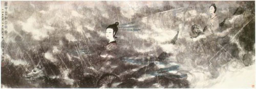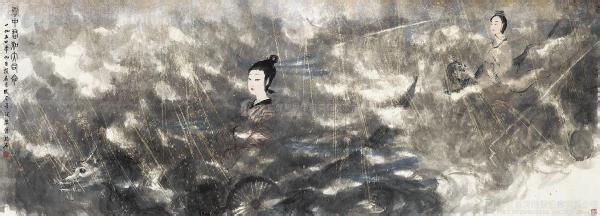 在《云中君和大司命》横幅与竖幅的同题材作品中,可以看到云中君与大司命演绎的爱情故事。虽然他们在画面中的位置不同,人物也有大有小,但云中君始终占据着主要地位。在这件作品中,我们看到了傅抱石娴熟的水墨技巧,以及他表现雷霆暴雨的空间关系以及具有神话象征的特殊的气象。在这种特殊的气象中, 挥洒留下的痕迹,与墨色的浓淡渲染,写的意蕴表现了傅抱石的水墨特质。