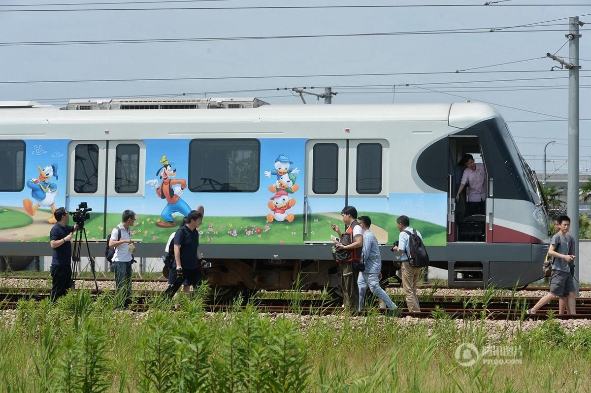 2016年6月14日,上海地铁迪士尼主题列车在地铁川杨河基地正式亮相,该车身及车厢内部喷有迪士尼经典卡通人物形象,包括米老鼠、唐老鸭等,该主题列车将于16日中午正式运行。赖鑫琳 摄