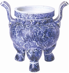 历史发展到大明王朝,经典的永宣海水山石纹可谓独树一帜,它不仅作为主题纹饰出现,还大量运用于边饰和辅助纹饰,成为这一时期极具时代特征的纹样;这尊明永乐青花海水山石纹鼎式香炉(图2)现藏北京故宫博物院,它不仅彰显着永乐朝强盛的国力,也充分展示了官窑高超的制瓷技艺。浑厚庄重的铜鼎样式器型彰显着气势雄伟,外壁以钴料苏麻离青绘深邃浩瀚的海水山石纹:象征大江大河的海水纹呈汹涌澎湃之势,留白的浪花如佛手飞溅,在波涛中耸立着形似姜之芽的山石,两者组合强调“江山”之意、寓皇权“江山永固”、称“海水江崖”。此纹样影响着同期及后世海水和山石纹的发展。