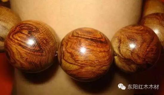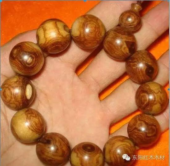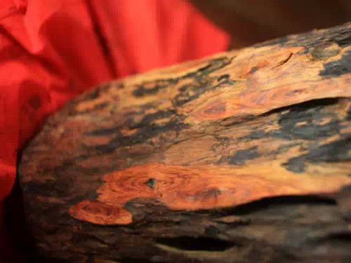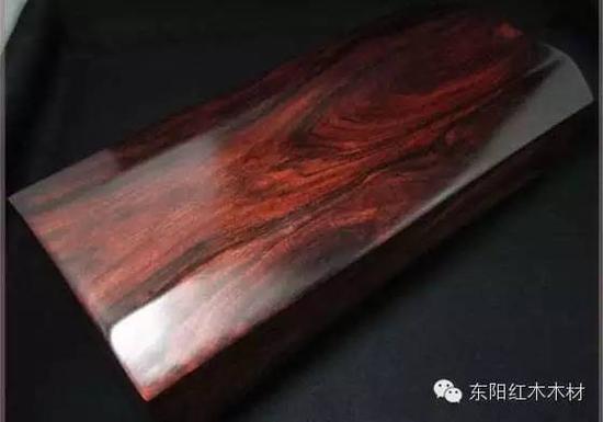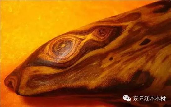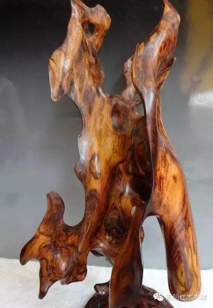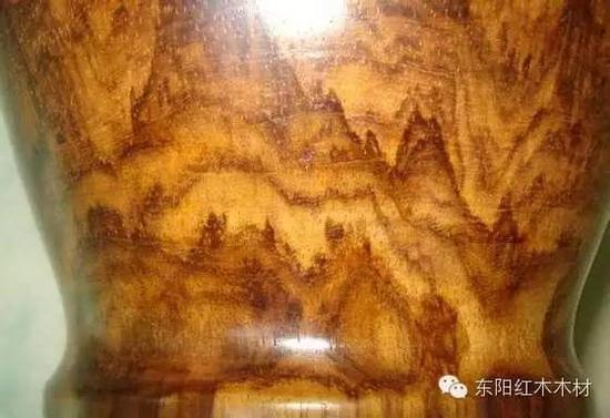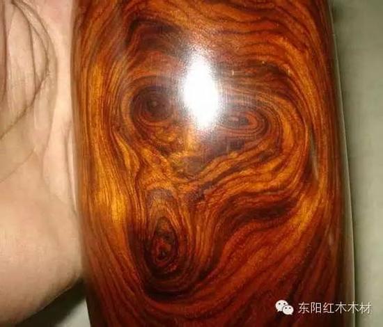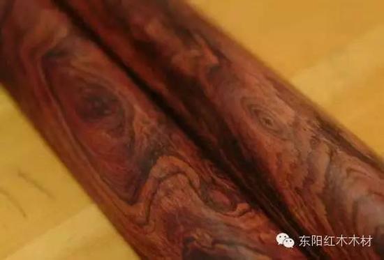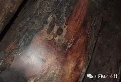 第一种,砍伐后经过1-3年自然虫蚀、潮化、风化过程。以前黎族人砍伐黄花梨后,先自然摆放让白蚁啃食黄花梨边材,当遇到有辛辣芳香而又坚硬的格就会停止咬蚀,虫蚀过后裸露的格经过多次反复的潮化、干燥,再潮化、再干燥,使心材部分颜色趋于加深,色泽醇厚而一致,油质及降香物质浸润全身,经打磨后木材表面润泽细腻,并呈现出萤火虫般的萤光。这种材料制作家具不用烘干,不易开裂和变形,而且颜色漂亮香气浓郁,见下图: