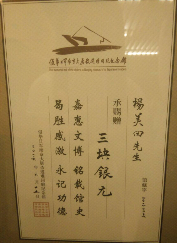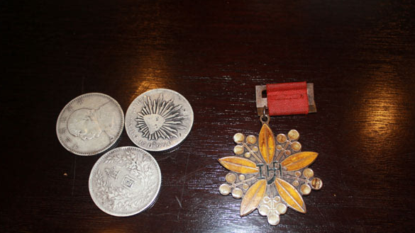 昨日,在位于江东门的侵华日军南京大屠杀遇难同胞纪念馆,来自泗洪县的抗战老兵张道干和来自河南南阳的杨美田老人,向纪念馆捐赠收藏70多年的3块银元和张道干在朱家岗战斗中缴获的一枚日军奖章。