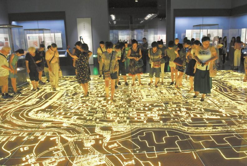 市民参观成都历史文化陈列厅(民俗篇)的成都老地图。