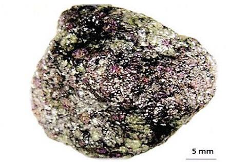 科学家用X射线对这块岩石进行扫描后发现,里面的钻石的外径仅有1毫米,呈八面体。整体形状类似底对底粘在一起的两座金字塔。红色和绿色来自较大的石榴石、橄榄石和辉石晶体。