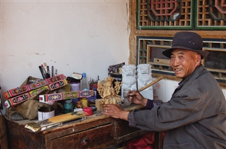 今年63岁的张宗宏是互助县红崖子沟乡张家村人,土族木雕艺人,从事木雕工艺已经三十多年了。每年承揽佛像雕刻、寺院装饰等木雕工程。设置在自家院落的工作台上,刻刀、圆铲、锯子、三角尺等工具摆满了整个雕刻案。