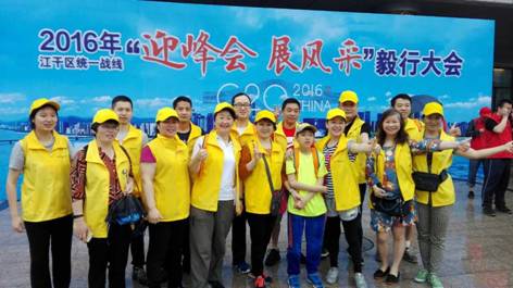 5月28日上午,杭州市江干体育中心广场锣鼓喧天、人声鼎沸,2016年江干区统一战线“迎峰会 展风采”毅行活动在这里举行。致公党江干总支的党员们在主委莫清兰的带领下,穿上黄马甲,戴好黄沿帽,整装待发。