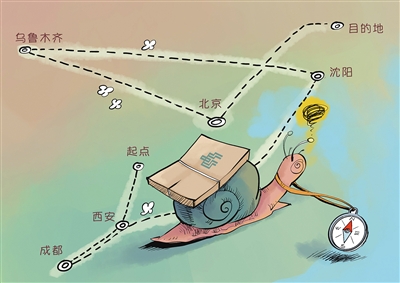 一个始发地为陕西延长县四家河邮政所,目的地为呼伦贝尔牙克石投递局的邮件,按说一路北上3天即可到达,却折返西安、中转成都、乌鲁木齐,经过10站,历时13天,才最终送达。寄件的陈先生认为这可能对他造成了2万元的损失。对此,中国邮政集团公司延安市分公司一位负责人称,“按理来说,应该朝目的地走。”(6月19日《华商报》)