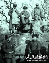 陈毅(坦克上中)等在缴获的坦克前和战士合影。