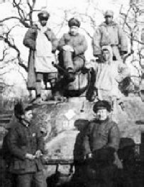 陈毅(坦克上中)等在缴获的坦克前和战士合影。