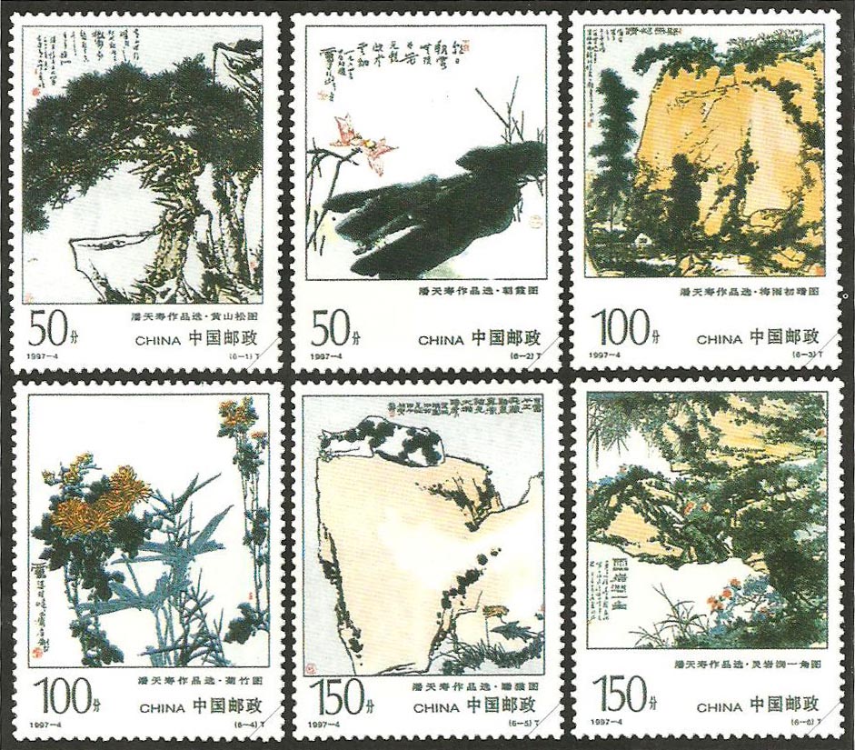 潘天寿(1897- 1971)早年名天授,字大颐,号阿寿,常自署雷婆头峰寿者。中国现代画家、美术教育家。长期从事绘画活动和美术教学。中华人民共和国成立后,曾任中国美术家协会副主席、浙江美术学院院长。潘天寿一生以弘扬民族美术为己任,淡泊名利,刚直不阿。擅长写意花鸟和山水画,能融诗、书、画、印于一炉,创造了沉雄阔大、苍古高华的艺术风格。着有《中国绘画史》、《治印谈丛》等。1997年3月14日,正值潘天寿诞辰l00周年纪念日,中华人民共和国邮电部发行一套1997-4《潘天寿作品选(T)》特种邮票,全套6枚。潘公凯、励国仪设计。面值(6-1)(6-2)50分,(6-3)(6-4)100分,(6-5)(6-6)150分。票幅规格38毫米×50毫米。发行量(6-1)为3080.1万枚,(6-2)为3022.5万枚,(6-3)为2697.7万枚,(6-4)为2598.5万枚,(6-5)为2592.1万枚,(6-6)为2572.9万枚。影写版。齿孔11.5度。邮局全张枚数32(8×4)。北京邮票厂印制。